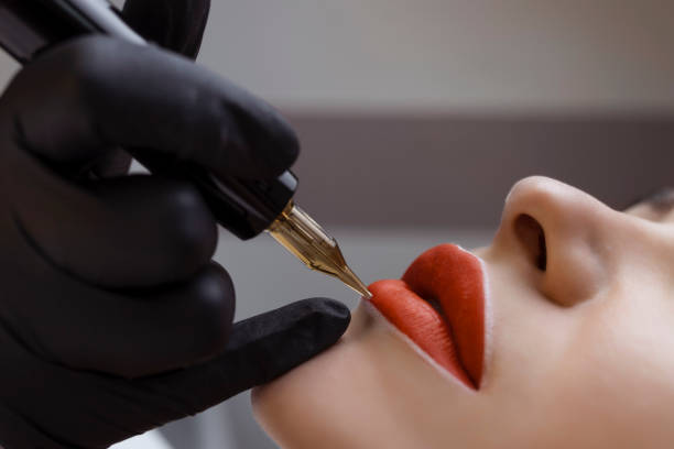 Cosmetologist makes permanent makeup on a woman’s face. Specialist applies a tattoo on the patient’s lips close-up.